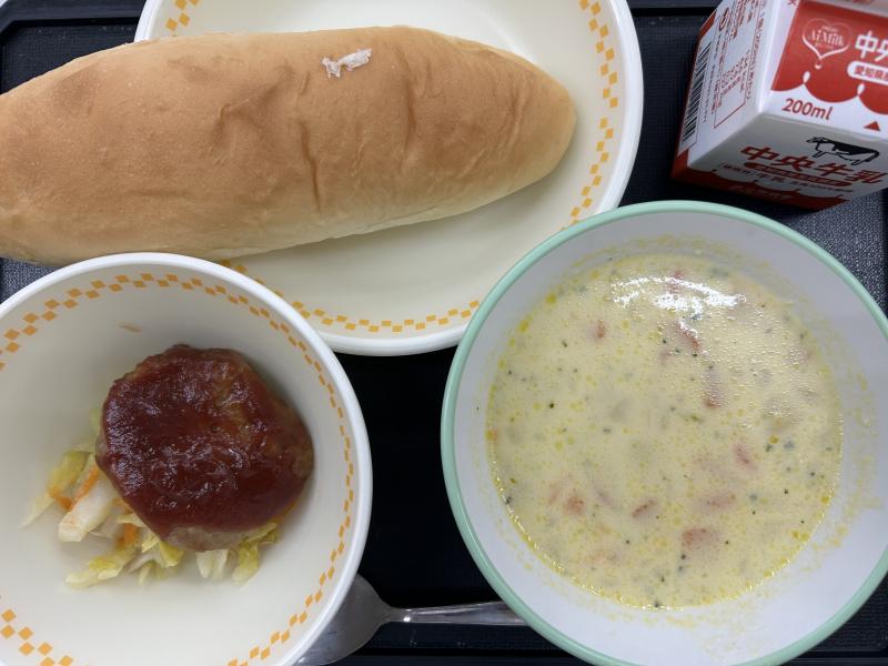 今日の給食は、ミルクロール、ハンバーグのケチャップソースかけ、やさいソテー、コーンクリームスープです。