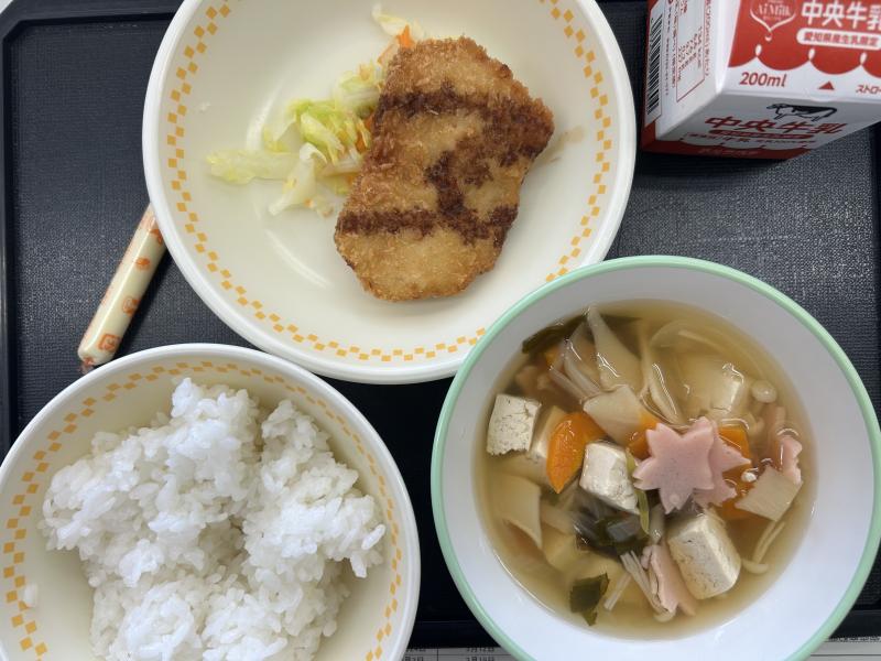 今日の給食は、ごはん、チキンカツ、ゆでやさい、すまし汁、スティックチーズです。