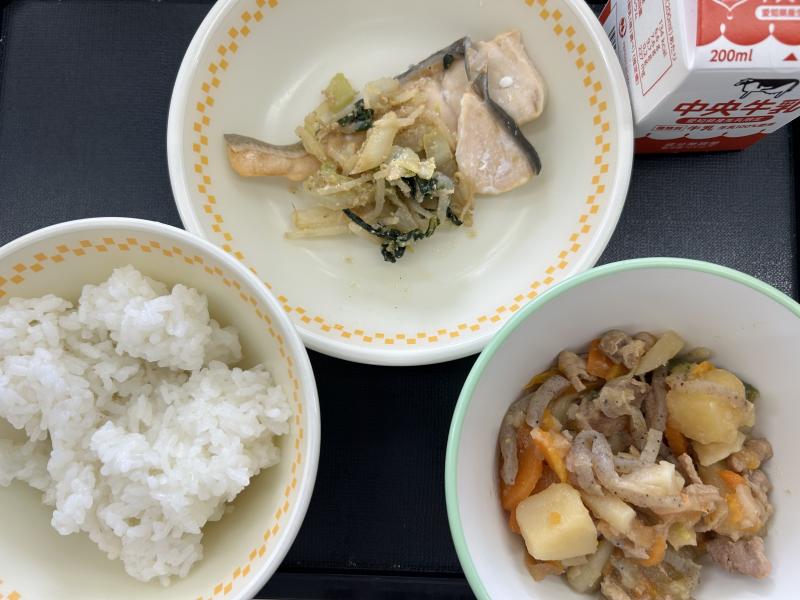 今日の給食は、ごはん、さけの塩焼き、ごまあえ、肉じゃがです。