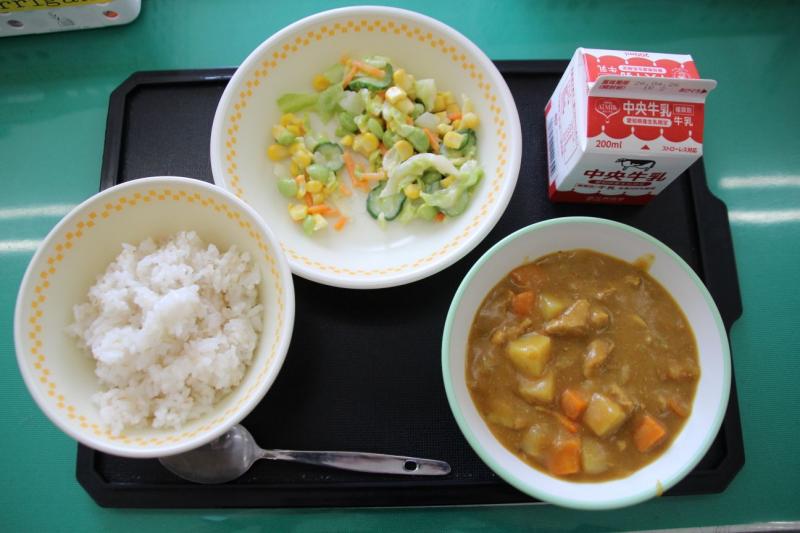 今日の給食は、ごはん、春キャベツのサラダ、米粉カレーライス、牛乳です。