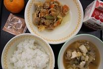 今日の給食は、ごはん、肉やさいいため、キムチなべ、みかん、コーヒー糖です。