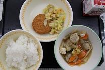 今日の給食は、ごはん、ミンチカツ、大豆サラダ、たぬき汁です。