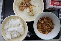 今日の給食は、ごはん、すりみ入りコーンしゅうまい、ゆでやさい、マーボー豆腐です。