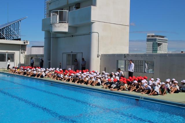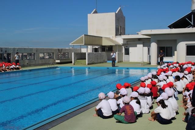 本日はプール開きを行いました。朝に全校児童が集まり,校長先生のお話やプールの活動における注意点の話を聞きました。その前には,プールの安全祈願を行いました。これからいよいよ楽しいプールが始まります。