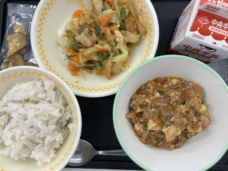 今日の給食は、麦ごはん、やさいとはるさめのオイスターソースいため、マーボー豆腐、さつまいもチップスです。