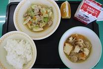 今日の給食は・・・ごはん、豚肉とやさいのオイスターソースいため、とりだんごのスープ煮、牛乳、あまなつみかん です。
