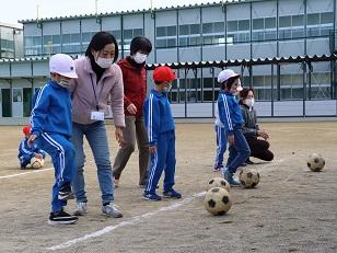 こちら、昼に外に出てきた子どもたち。先生も一緒に楽しく。