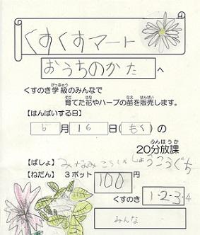 16日の木曜日にくすくすマートを開催します。子どもたちが種まきをして,毎日水やりをしました。苗とは違い,育てるのは難しいですが頑張ってお世話を続けています。よろしければお立ち寄りください。