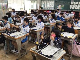 3年生の教室では、買ってもらったばかりの習字道具を使って毛筆の授業。先生の話をよく聞いて、姿勢よく筆遣いの練習に臨んでいました。ひきしまったいい表情です。