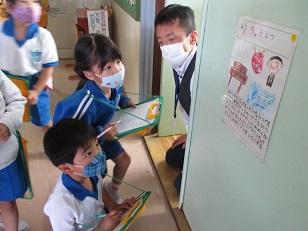 1年生が5~6人のチームになって、学校中の部屋を探検です。各部屋には、2年生が去年作ってくれた紹介パネル。一生懸命読んでから、黄色いシールの数字を書き写していました。