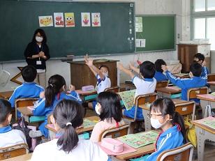 3年生の教室から楽しそうな声が。訪ねてみると、SAの松原先生と担任さんが、英語の授業中。「習いたて」の英語もとっても楽しそう!そして、「生まれたて」は、この季節のアイドル、そう!子つばめです。