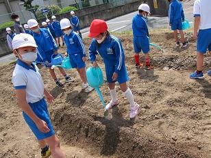 3年生もひまわり、おくらなどを種まき。水やりしっかりね。