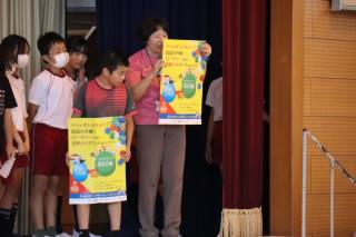 〈「ペットボトルキャップを夏休み中に集めてください。9月初めに集めます。集められたキャップは、ワクチンに変わります。」と全校への呼びかけがありました。〉