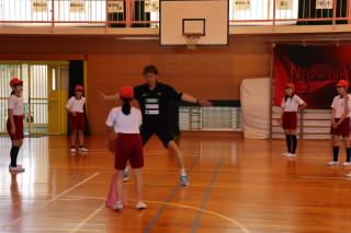 続いてバスケットのシュートの仕方を教えてもらいました。「腕だけでなく足をしっかり曲げて体全体を使ってシュートすることが大切だよ。」と手本を見せてくれ、実際にシュート練習をしました。その後、30秒でシュートが何回入るかチームで競争しました。