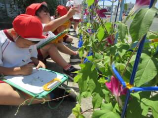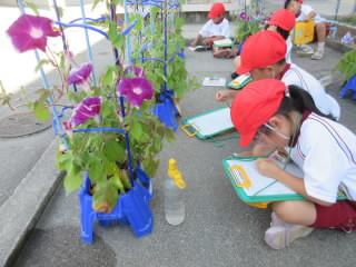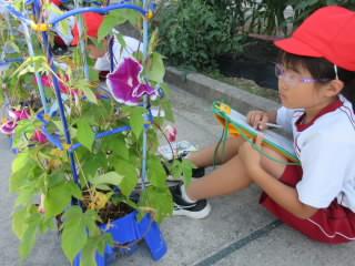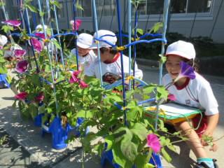 これまで、子どもたちはアサガオに名前をつけて、アサガオのお父さんお母さんとして一生懸命に育てています。毎日水やりをしたり、アサガオに話しかけたりしながら、ちょっとした変化にも気づくようになりました。今、アサガオの花はたくさん咲いて、子どもたちは大喜びです。