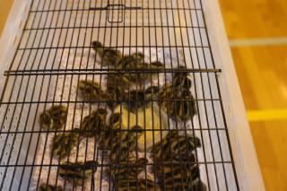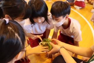 〈「小哲の部屋」で飼育しているウズラの赤ちゃんを触らせてもらいました。「かわいいね。ピイ、ピイ鳴いてるよ。」「優しくさわろう。温かいな」などいろいろな声が聞こえてきました。〉