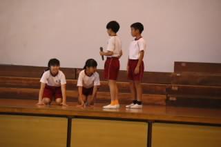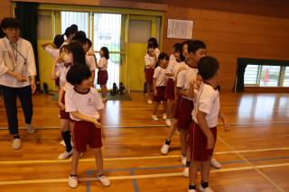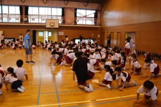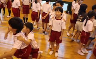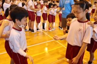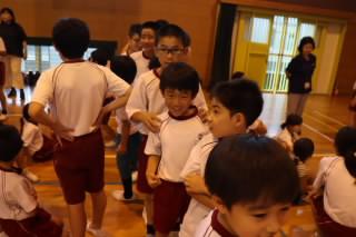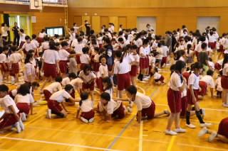 次に進化じゃんけんをしました。それぞれ思い思いに移動して同じ仲間を探してじゃんけんをします。勝てば、進化しますが、負ければ退化します。全校で楽しみました。