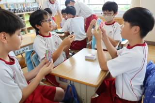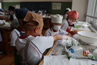 昨日(22日)取ってきた梅を、さっそく1・2時間目を使って漬けました。水滴が残らないように洗った梅を丁寧にキッチンペーパーでふき取りました。その後、梅を傷つけないように爪楊枝でヘタを一つ一つ気をつけながら取りました。そして、チームで協力して、氷砂糖と梅を袋に入れていき、完成しました。子どもたちは、嬉しそうに取り組んでいました。