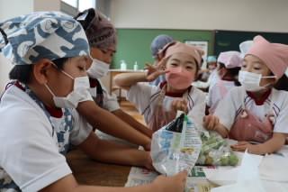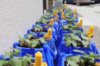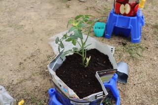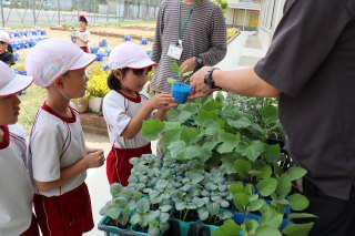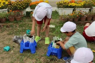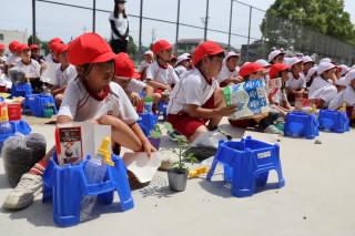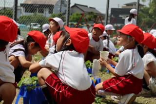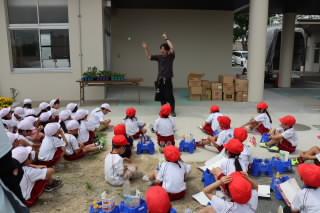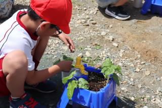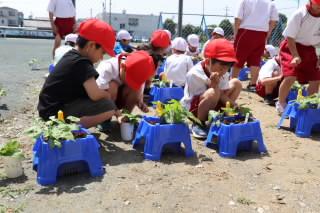 自分が育てたい野菜を一人一人受けとった後、土の入れ方、苗の植え方を丁寧に教えてもらいました。子どもたちは、茎を折らないように優しくポットから苗を取り出す作業にどきどきです。みんな上手に植えることができました。早く大きくなって、実をつけるのが楽しみです。