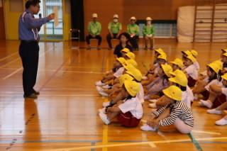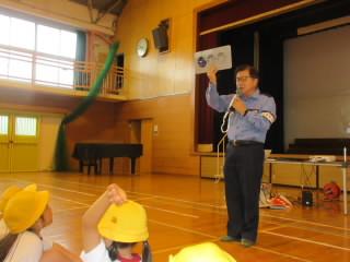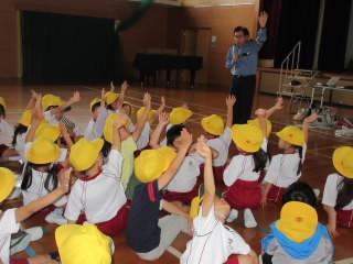 そのため、2時間目に体育館で交通安全教室を開くことになりました。交通指導員の方5名が来校し、交通安全のアニメを見ながら信号の見方や横断歩道の渡り方などを確認し、1年生に交通安全についてクイズを交えながら楽しくお話をしてくださいました。
