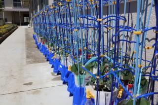 1年生が名前をつけて育てているアサガオ。昨日の大雨をものともせず、今日の太陽の光をしっかり浴び、元気に育っています。