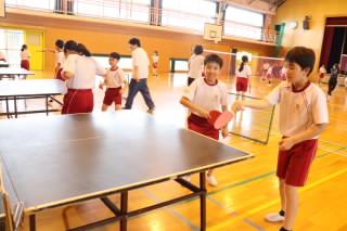 〈上級生が下級生に卓球は、こう打つんだよ。と教える姿が。うまく打ちかえしたら、上級生から「上手!その調子!」と声掛けも〉