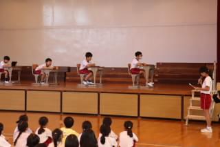 全校朝会に話し方大会で発表する内容を披露しました。聞き手に状況や思いが伝わるよう身振りも入れながらスピーチすることができました。