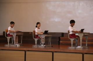 児童朝会で、保健委員会の子たちがメディア使用時の正しい姿勢と目の体操について発表しました。