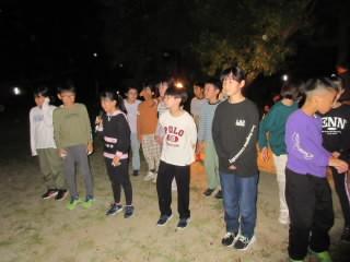 〈夜は、楽しみにしているキャンプファイヤーで盛り上がりました。子どもたちが考えたゲームをしたり、ダンスで盛り上がったりしました。〉