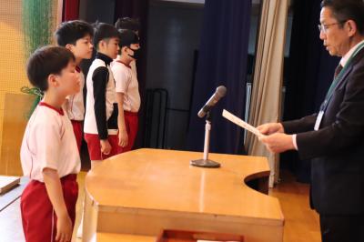 一覧へ 1. 令和6年度前期認証式 5月1日 投稿日時: 2024/05/01 主担 全校朝会で委員会の前期委員長の認証式がありました。4年生から6年生までが委員会に取り組み、学校がよりよくなるために活動します。 今年もそれぞれの委員会で話し合い、目玉活動としてキャンペーンに取り組んだり、児童集会で委員会の取り組みを発表したりしていきます。 校長先生から認証書を受け取り、委員長のみなさんの顔も引き締まっていました。