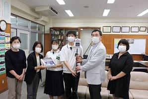 社会を明るくする運動の一環として、校区の保護司会・更生保護女性会の代表のみなさんから、自動検温計と絆創膏を寄付していただきました。絆創膏については全員に配付、検温計は保健室で活用していこうと考えています。地域の方々が本校・本校生徒のことを考えていただいていることに改めて感謝します。ありがとうございました。