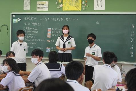 6月15日(火)5・6限に生徒総会を行いました。現状では全校生徒が一堂に会するできないため、テレビ放送を使い生徒会から問題提起を行い、各学級で話し合うという形で行いました。「よりよい牟呂中にするためには」という校内アンケートの結果をもとに、テーマを「時間を守るためには」に絞り、各学級で話し合い、最終的に学級目標を決めました。どの学級でもしっかりと話し合う姿が見られました。今後は自分たちで決めたことの「実践」を期待しています。