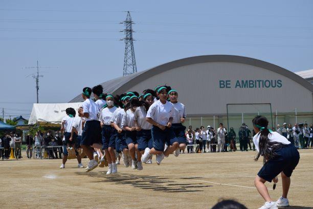 金曜日の雨で1日延期しての開催となりましたが、全校生徒が運動場に集い、力いっぱい競技に取り組みました。勝利して仲間と喜び、負けて悔しがり、そして、熱い声援を背に真剣な表情で競技に臨むなど、生徒たちが生き生きと躍動する姿が多く見られました。