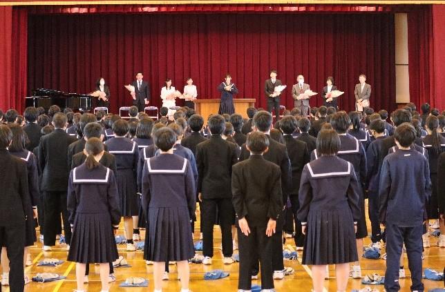 4月15日(月)に、2,3年生が本校体育館に集まり、「退任式」を開催しました。