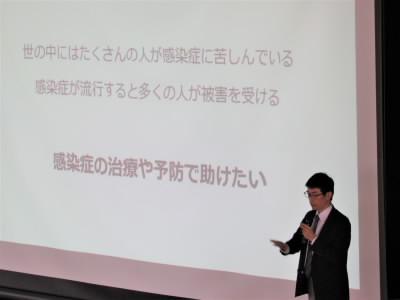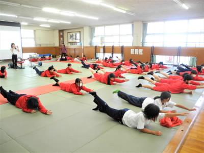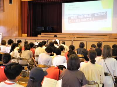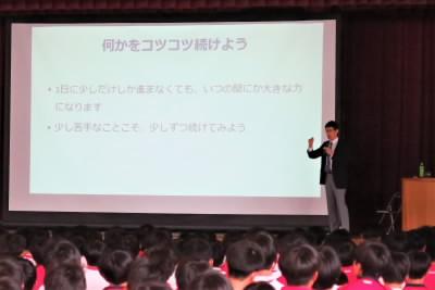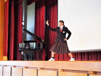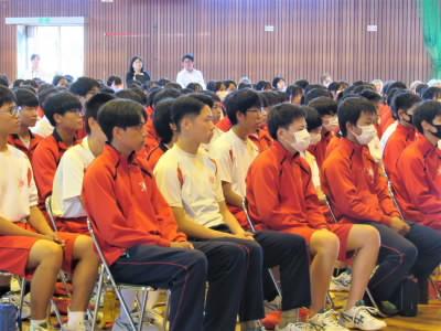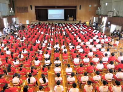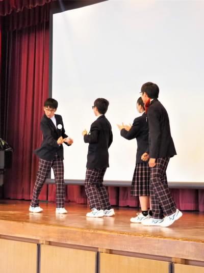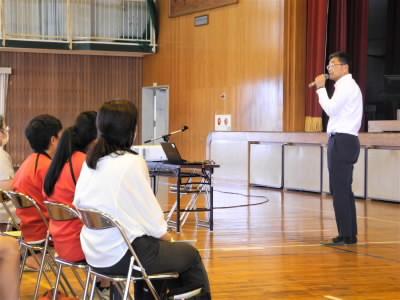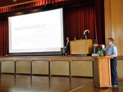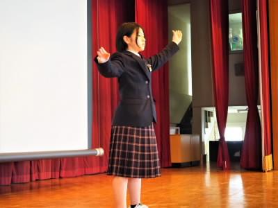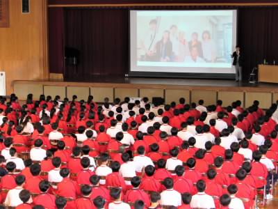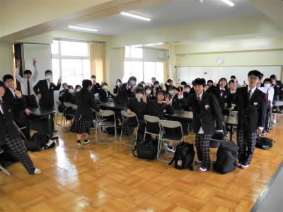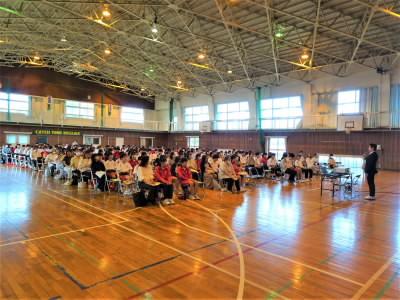 健康運動指導士を講師にお招きし、第3回学校保健委員会『元気いっぱいひなたくんPart3~メディア使用と姿勢の関係について~』を行いました。メディアの長時間使用が身体に与える影響やメディアの適切な使用方法、そして、正しい姿勢について教えていただきました。講師の古田先生の巧みな話術と実際に効果的なストレッチの実演を入れてもらうことで、生徒たちはとても楽しく参加することができました。講演が進むにつれて、生徒たちの姿勢が目に見えてよくなっていったことから、メディア使用と姿勢や生活習慣の関係について意識を高めることができたようです。