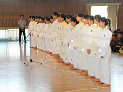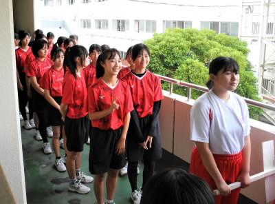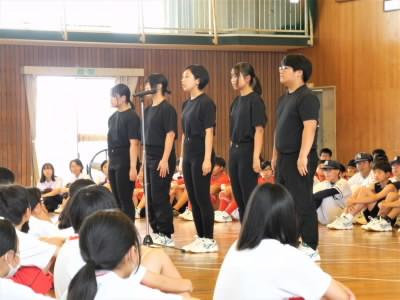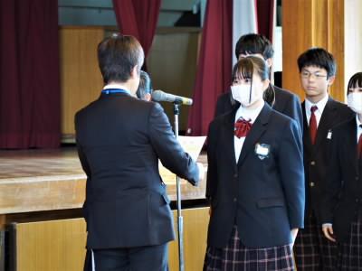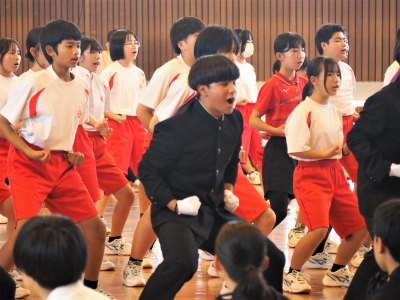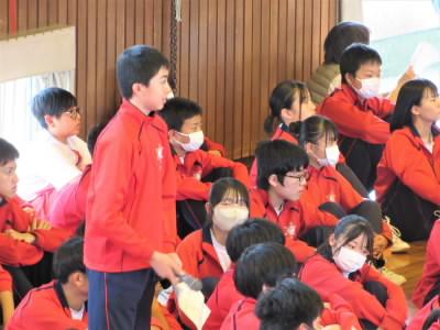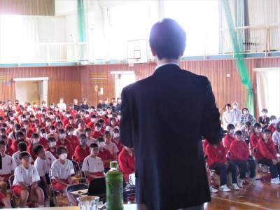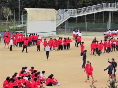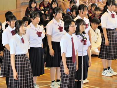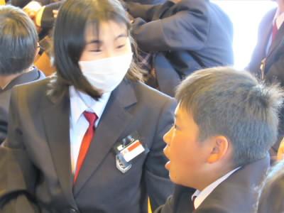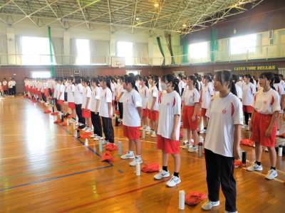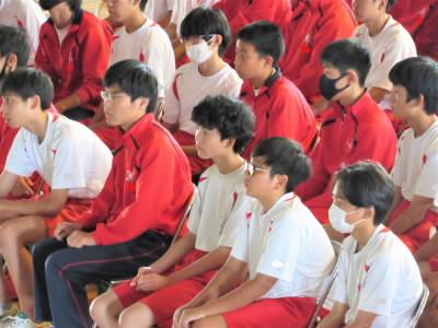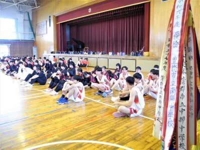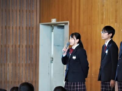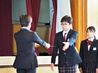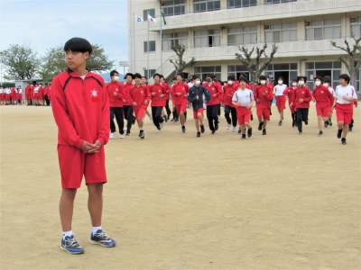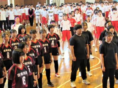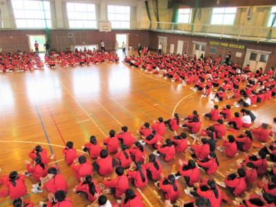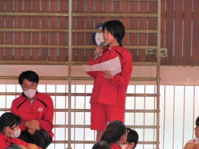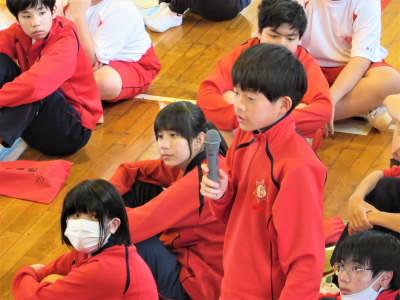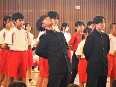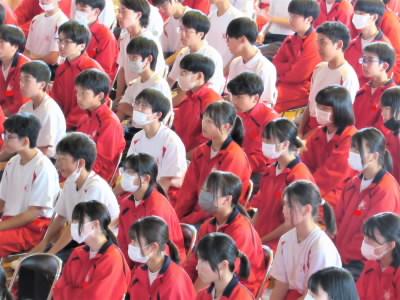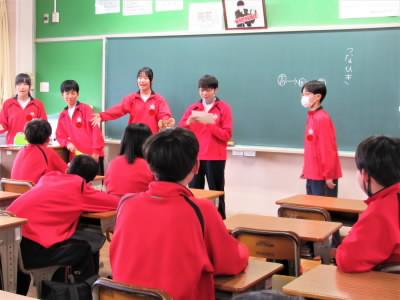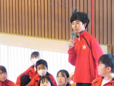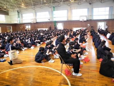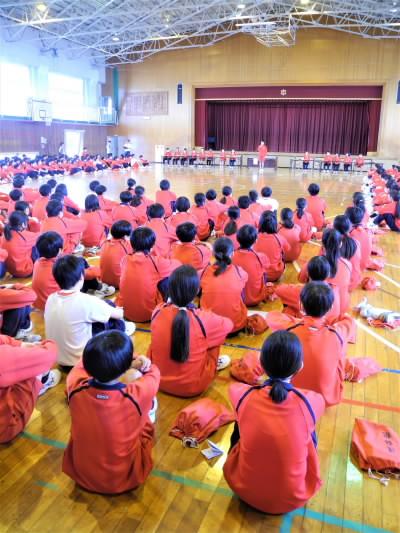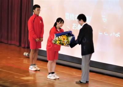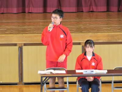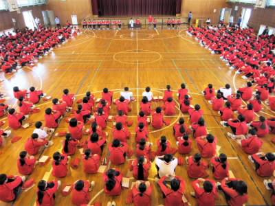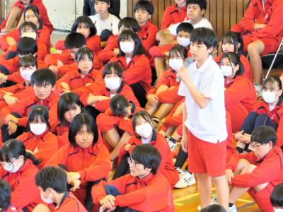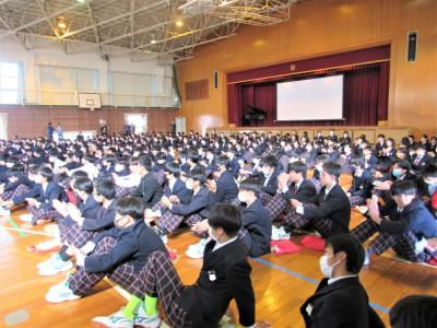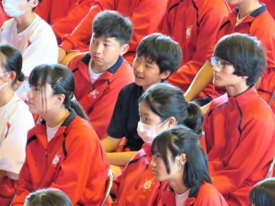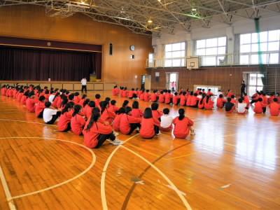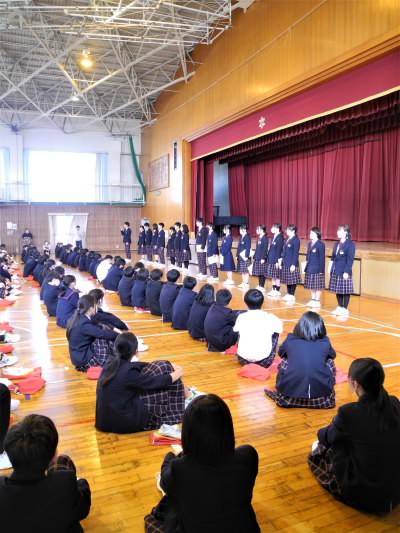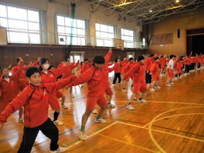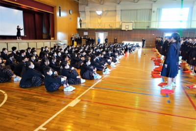 「朝の会の時間に、〇〇さんの壮行会を体育館で行うので、来ていただけませんか」ある学級の級長の突然の申し出でしたが、行ってきました。明日、12月7日(土)愛知駅伝(愛知県市町村対抗駅伝競走大会)「*TV中継あり」に豊橋市の代表として1区を走る予定の生徒と、穂の国とよはし芸術劇場”PLAT”での公演『海に生きる』に出演する生徒の壮行会をサプライズで企画したようです。二人の活躍を願って、学級応援団による演舞、応援歌熱唱、そして、花道をつくって激励しました。練習なし、ぶっつけ本番で臨んだようですが、生徒たちの思いは確実に二人に届いたと思います。とても素敵な壮行会でした。