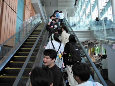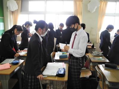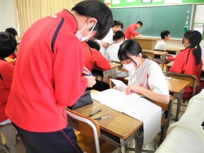 1限と2限、3階の3年生フロアは、静まり返っていました。『全国学力・学習状況調査』が行われ、どの教室からも「コツコツコツ」と、解答用紙に必死に書き込む音しか聞こえず、緊張感に包まれていました。みんなの『ヤル気』がひしひしと伝わってきました。それとは逆に、2年生のフロアからはとても楽しそうな声が聞こえてきました。ALTによる英語の授業です。生徒一人一人が、例にならって4つの質問を考え、「去年違うクラスの生徒」「部活動が違う生徒」に次々にインタビューしていきます。とても楽しそうに、英語でコミュニケーションを深めていました。