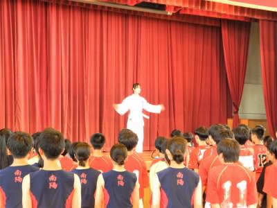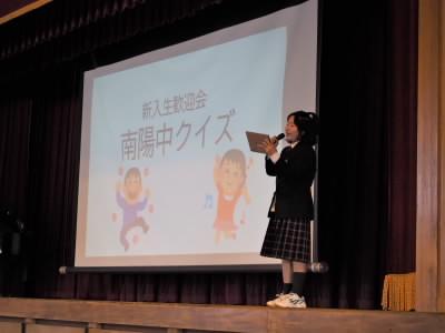 『新入生歓迎会』を行いました。吹奏楽部の演奏で体育館へ入場した1年生!その表情は、やや緊張した様子でしたが、先輩たちのあたたかな雰囲気により、しだいにほぐれていきました。生徒会の企画による「南陽中クイズ」で、学校施設や学校の様子について紹介をしたり、南陽中の三本柱『歌声』『挨拶』『掃除』を劇を交えて伝えたり、会は大いに盛り上がりました。その後の部活動紹介では、各部の部長が1年生に活動内容を紹介しながら、入部を呼びかけました。1時間ほどの会でしたが、1年生の笑顔いっぱいの表情から、先輩たちのあたたかさや、南陽中学校の雰囲気が伝わったようです。