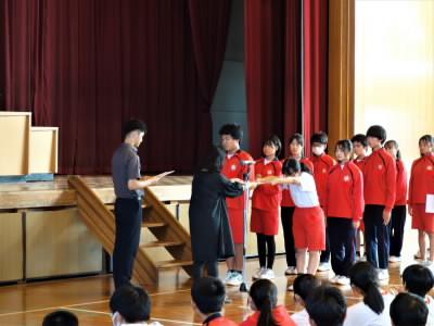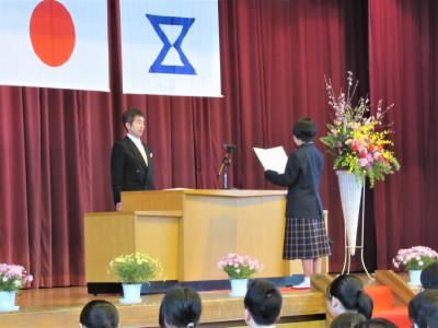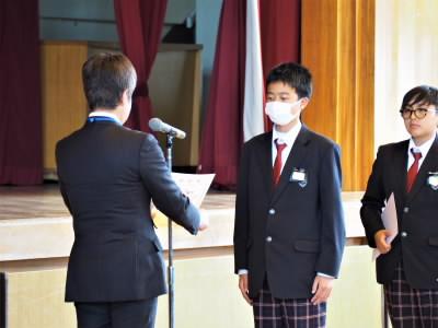 『NOS会』において、生徒会執行部等の認証式を行いました。前期の生徒会執行部と委員長のあいさつに続いて、後期の「生徒会執行部」「各委員会の委員長・副委員長」そして、「学級三役の代表」に任命証が手渡され、全校生徒の前で『決意』や『豊富』を堂々と話しました。南陽中恒例?の地声で叫ぶ「ありがとうございました!」「よろしくお願いします!」の大声と、全校生徒の拍手が何度も何度も体育館に響き渡りました。とても頼もしく感じるとともに、これからの南陽中がますますよくなるような期待がもてました。