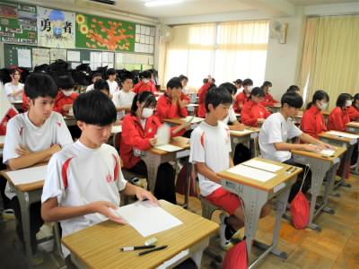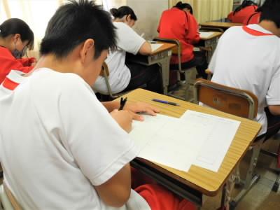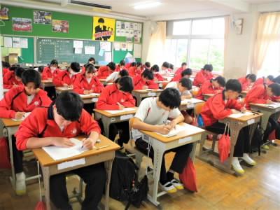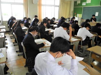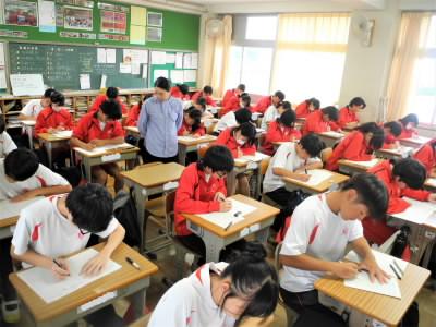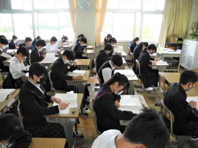 今日、明日と、とても大切な『中間テスト』です。テスト開始直前まで教科書やワーク、ノートを熱心に見直し、問題用紙が配られると緊張がピークに達します。開始のチャイムと同時に、全員が一斉に問題用紙を開いて解き始めます。どの教室からも、どの生徒からも、みんなの「ヤル気」が伝わってきました。あと1日、全力でがんばってください。