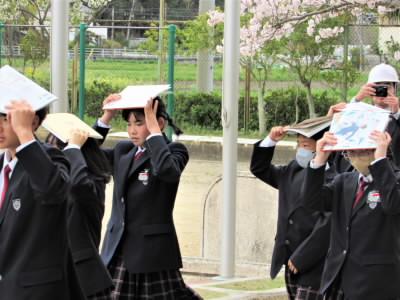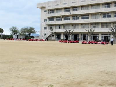 避難訓練を実施しました。予期せぬ災害に備えて、南陽中学校では、年に2回の避難訓練を予定しています。第1回は、地震発生の後、第2理科室と調理室より出火したことを想定して訓練を行いました。教室で事前指導を受けた後、訓練開始です。「訓練、地震発生!」の放送に、素早く机の下に身を隠す生徒たち。「避難開始」の指示を待って、頭部を守りながら運動場に避難しました。全員が真剣に取り組み、無事に避難することができました。訓練の最後に、3年生が昨年(2年時)の社会科の授業で作成した『避難相談マップ(NOSマップ)』について説明しました。その後行われた「町別生徒会」「町別引率下校」は、訓練とは違って子どもたちの笑顔とピースサインがあふれていました。通学路の危険個所調査を兼ねて引率する担当教師と、とても楽しそうに談笑しながら歩く姿が印象的でした。
