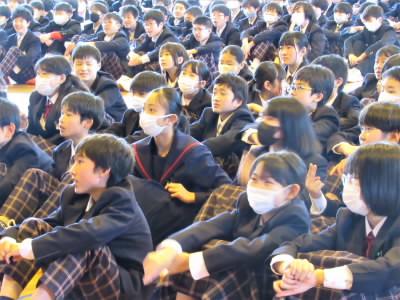 南陽中学校に、生徒たちの元気なあいさつと明るい笑顔がもどり、「3学期始業式」を行いました。インフルエンザ等感染症対策として、校歌合唱がなくなってしまいましたが、体育館への入場・整列や話を聞く様子から、生徒たちの3学期への『意気込み』を感じました。これまでの自分から「脱皮」して、「ヘビー(蛇)」な毎日にもめげず、大きく「実(巳)」を結ぶ!南陽中生の、さらに進化した姿を楽しみにしています。