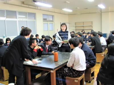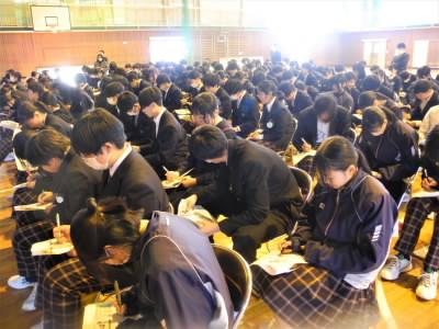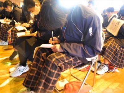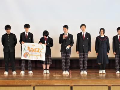 「Nanyo Only Students」今年度最後の『NOS会』を行いました。今回は、来年度の生徒会テーマを決める話し合いと来年度の前期生徒会役員の認証式になります。事前に全校生徒から案を募集し、執行部が厳選した3つの候補の中から決定していきます。①ペガサス~はばたけ大空へ~(一人一人が、この大空《この先の人生》へはばたけるように)②えびFLY~明るい未来へ We can fly ~(えびフライをつくるには時間がかかるけど、楽しいしうれしい。明るい未来へ飛び立っていこう)③キャンバス~皆で彩る1つの絵~(一人一人が自分の色を大事にして、大きなキャンバスを彩っていこう)それぞれの提案者がテーマに込めた思いを発表したあと、質問や意見が出されました。1・2年生だけの初めての会でしたが、たくさんの生徒が意見を発表し、大行列ができるほどでした。どの意見も立派で、生徒たちが真剣に考えていることが伝わってきました。結果は4月に発表されるそうですが、来年度の生徒会活動も盛り上がると確信しました。楽しみで仕方ありません!