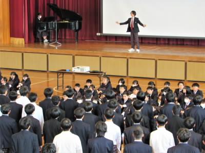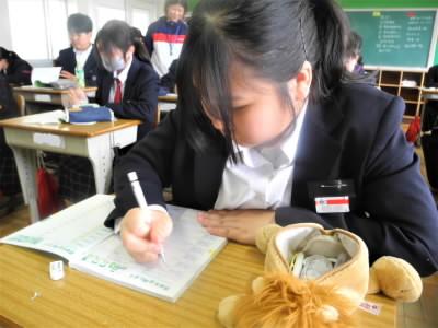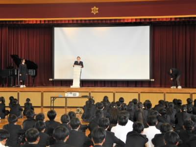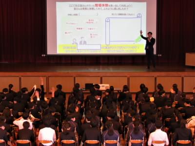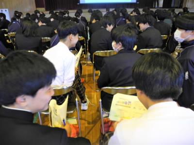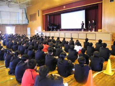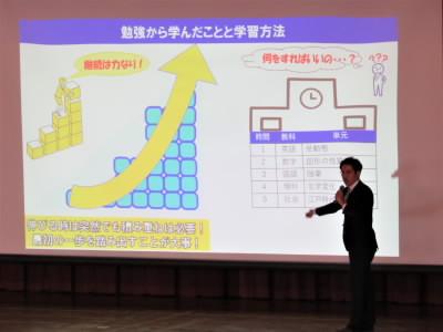東進衛星予備校から講師の先生をお招きし、2年生が『社会人に学ぶ会』を行いました。「職場体験学習」や「職業適性検査」を経験してきている生徒たちは、興味をもって真剣に聴いていました。クイズを取り入れる等、講師の先生の工夫と軽快な話術により、45分があっという間に過ぎてしまいました。短い時間でしたけれど、自分の『将来』や『夢』について考える、貴重な時間となりました。講師の先生、大変お忙しいなか本当にありがとうございました。