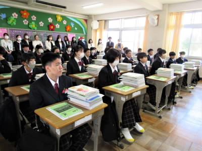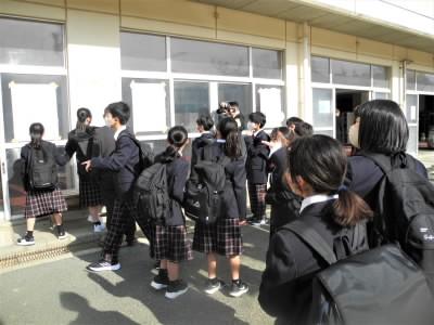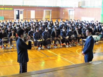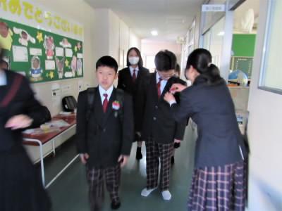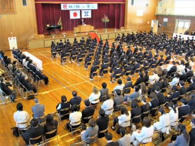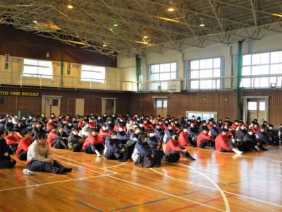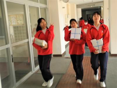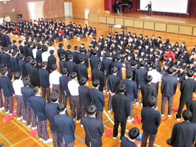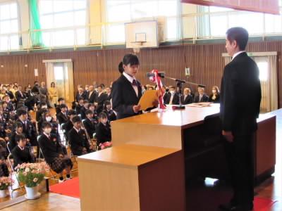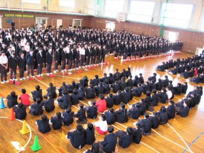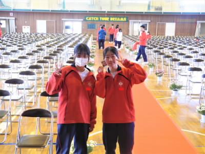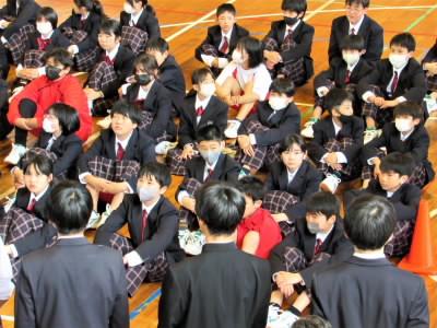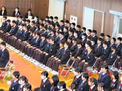 同窓会長とPTA役員2名にお越しいただき、『同窓会入会式・PTA記念品贈呈式』を行いました。代表生徒2名による「入会者代表あいさつ」「お礼のことば」は、落ち着いて堂々と話すことができ、とても立派でした。午後は、1・2年生が卒業式の準備に汗を流しました。みんな本当に一生懸命に取り組み、その様子から「3年生への思い」が伝わってきました。明日はいよいよ『卒業式』です。たくさんの祝福のなか、卒業生全員が胸を張って巣立っていくことを願っています。
