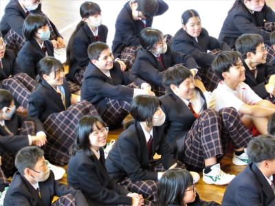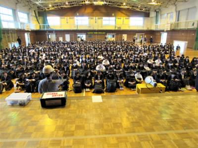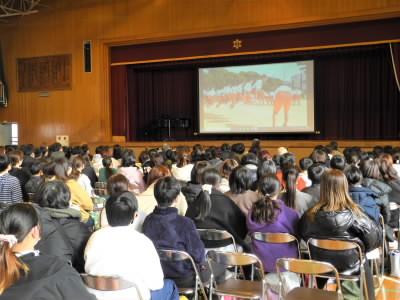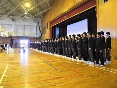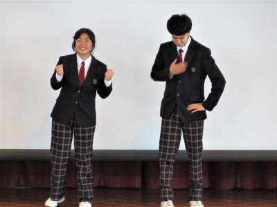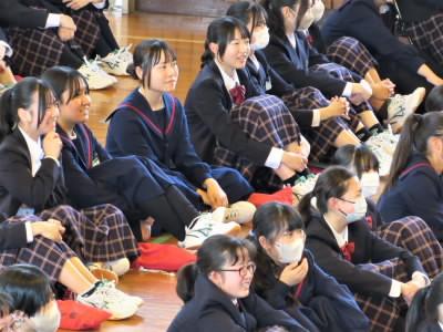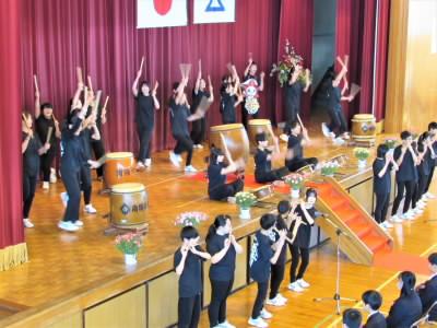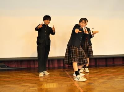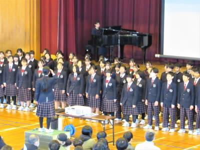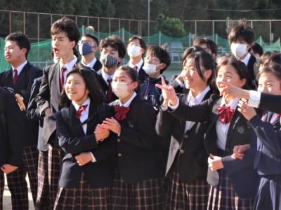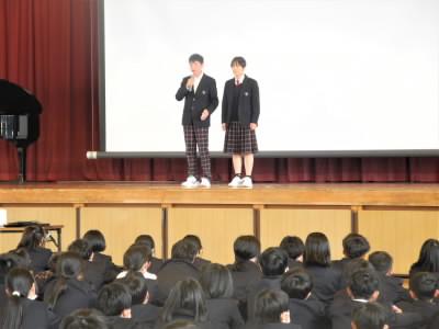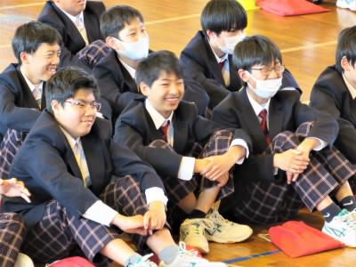 第1部は「1年生学年企画」、「2年生学年企画」そして、各学級ごとに作成した「お祝い掲示物」の紹介が行われました。そして、第2部では、生徒会企画(生徒会執行部によるお祝いパフォーマンスと各部活動から感謝のメッセージ)と「思い出のスライド・ビデオレター」が、第3部では「3年職員からの贈り物」とたくさんの企画があり、1・2年生と職員が精一杯のパフォーマンスで、3年生への『感謝』と『激励』の気持ちを伝えました。1・2年生、何より生徒会執行部の皆さんは、この会の企画・準備・運営と本当によく頑張りました。3年生だけでなく、全校生徒の「とびっきりの笑顔」と「あたたかな拍手」があふれる『3年生を送る会』でした。