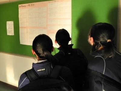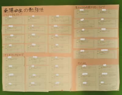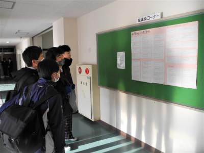 生徒会コーナー(掲示板)に、『南陽中生の勉強法』が掲示されています。生徒会が企画し、全校生徒にアンケートを実施し、まとめたものです。「こつこつやるタイプ」「ギリギリにやるタイプ」「集中できる時間が短いタイプ」等に分類されています。生徒たちも興味があるようで、立ち止まって読んでいる生徒をよく見かけます。一例を紹介します。①「こつこつやるタイプ」教科(理科・社会)用語暗記はとにかく五感を使う。「見る」「聞く」「書く」「読む」「嗅ぐ」など、あらゆる方法で頭に定着させる。特に「読む」は効果的。積極的に声に出す。②「その他」教科(英語)最近まで英語は大嫌いだったけど、今では少し好きになりました。そんな私の勉強法は、本文をまる覚えすることです。……。がんばれ、南陽中生!昇降口前では、今日も3年生有志の「あいさつ運動」です。解散したあとも、続けて盛り上げてくれる生徒がいます。ありがとうございます!