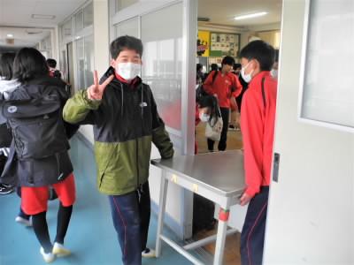 今日は、3年生にとって『最後の給食』でした。最後の献立は、「フィッシュバーガー(サンドイッチバンズ・たらフライ・ゆでやさい)、かぼちゃのポタージュスープ、牛乳」でした。どの教室も、準備からとても楽しそうでした。「おいしい!」「おいしい!」と、もう食べることのない給食の時間を堪能しているようでした。最後の「たらフライ」ジャンケンで負けてしまったのは、……。これも思い出です。