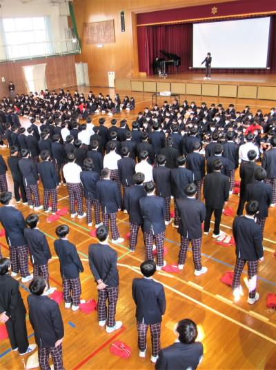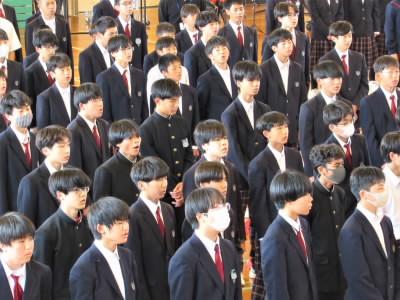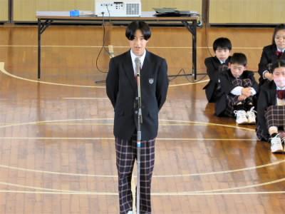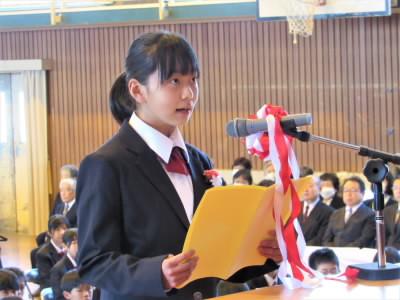 令和6年度の『修了式』を行いました。各学年の代表生徒に「修了証」を手渡したあと、2名の生徒に「1年の振り返りスピーチ」を発表してもらいました。二人ともしっかりとこの一年を振り返り、来年度の目標について、堂々と話すことができました。また、話を聞く姿勢や校歌の歌声、入退場の様子から、来年度への意気込みを、学校全体から感じました。各教室では、担任から「修了証」と「通知表」が渡され、一人一人がこの一年を振り返りました。『南陽中生』は皆、この一年で大きく成長しました。できるようになったことやがんばったことを自信とし、四月からまた、新たな目標に『挑戦』してほしいと願っています。