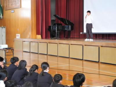 2年生が『英語スピーチコンテスト』を行いました。各クラスの予選を勝ち上がった6名の生徒が、パワーポイントを利用したり、身振り手振りを駆使したりして発表しました。「好きなタレントについて」「好きなキャラクターについて」「好きな本について」「好きなアーティストについて」「席替えでお気に入りの席」「笑顔は世界遺産!」私には、何を言っているのか半分も理解できませんでしたが、それでも言いたいことが伝わってきました。どれも、とても楽しかったです。2年生の「英語力」と「プレゼン能力」の高さに、とても驚かされました。